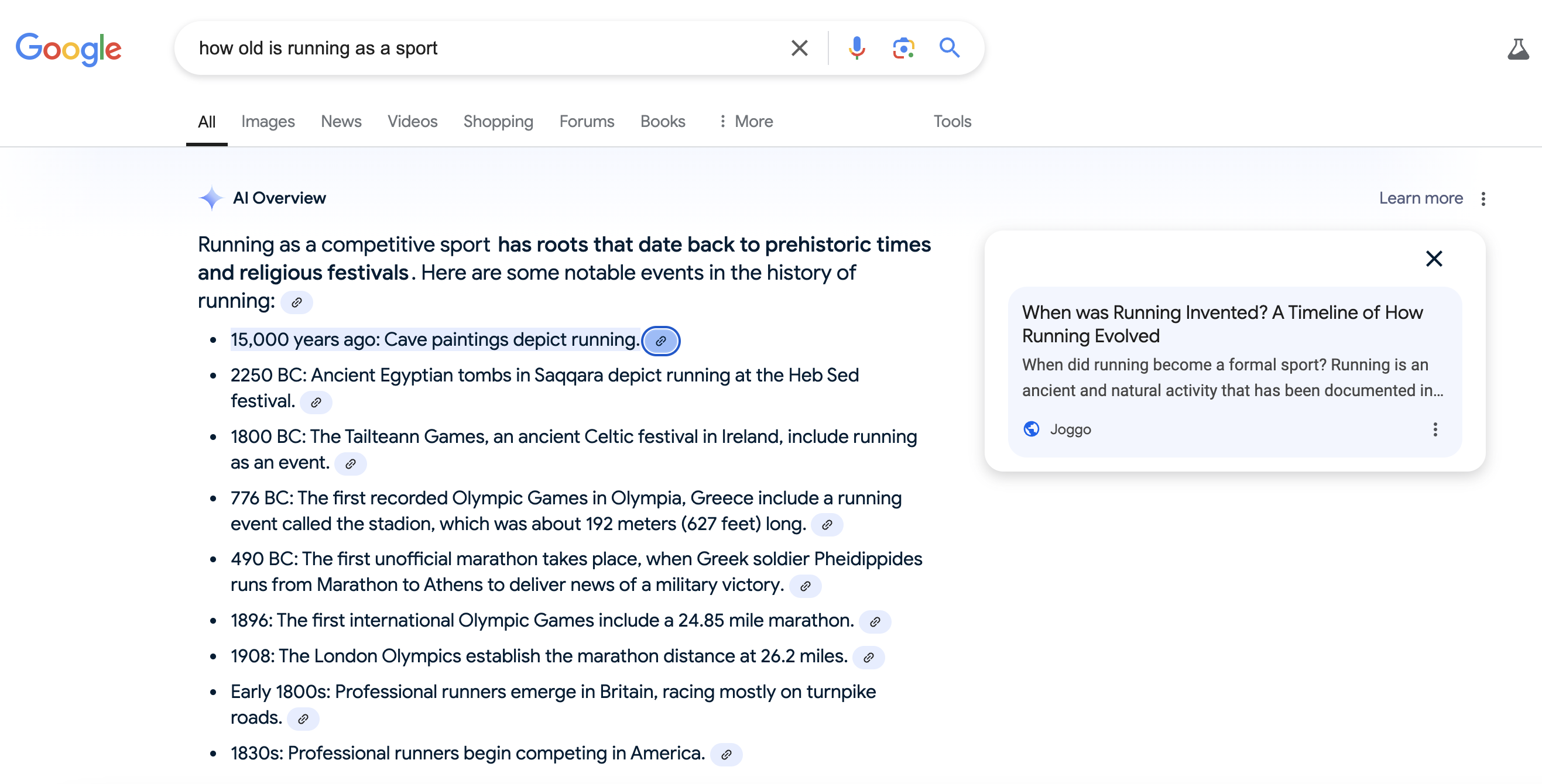 I am sure a few of you have googled the answer by now. If you have, you might have noticed that many websites claim that running as a sport dates back about 15,300 years ago, with depictions of men running on cave walls. Example 1. Example 2. Example 3. More often than not, these websites cite the cave paintings from the Lascaux caves in France as their source for that 15,300 number. Even wikipedia does. The funny thing I noticed is these websites tend not to show which painting supposedly has a man or men running for sport in it. Separately, I would still like to challenge that a man running because he is hiding from a predator or chasing down prey is not really a sport in how we define it. Unless you think being chased down by a tiger is a form of recreation, it’s not a sport yet.
